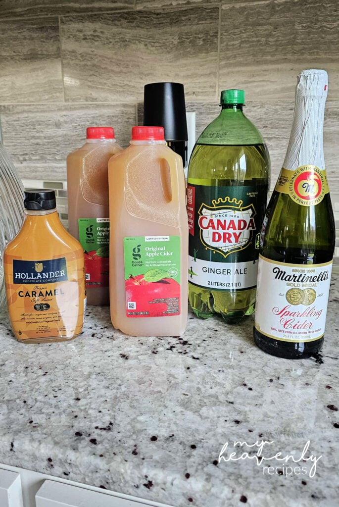 - To a drink dispenser or bowl, add your apple cider, ginger ale, sparkling cider, caramel and stir.
