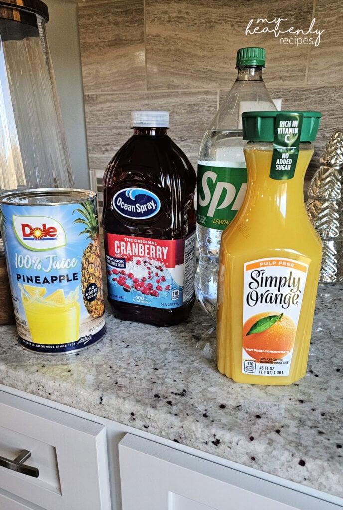 - In a drink dispenser, add the cranberry juice, orange juice, and pineapple juice. Top off with sprite last. Stir.