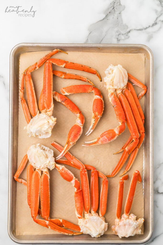 - Arrange and season. Place the crab legs on the baking sheet. Brush with melted butter or olive oil, and sprinkle with salt, pepper, or Old Bay seasoning.