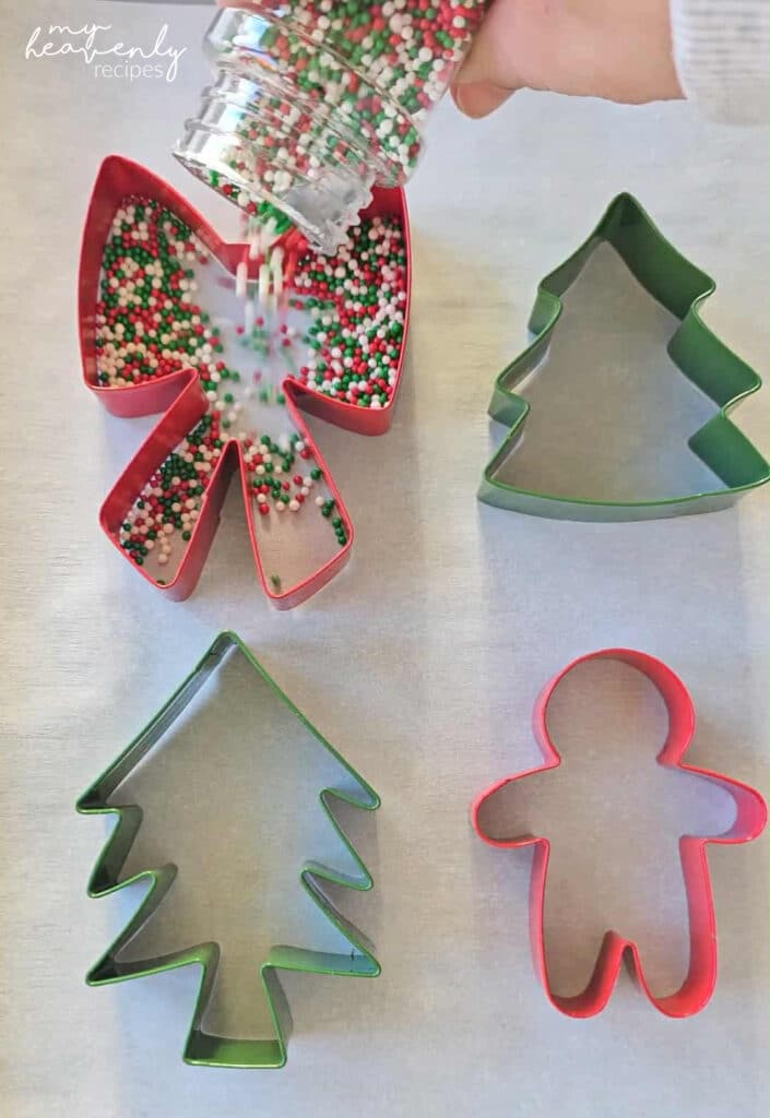 - Spread parchment paper on a cookie sheet. Lay out cookie cutters.