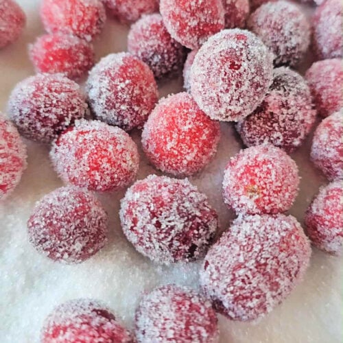 - Pour the extra sugar onto a plate and roll each cranberry.