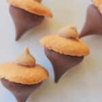 Pipe a dot of chocolate on top of the cookie and press a peanut butter chip. Let harden in fridge for 10 minutes.