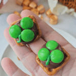 Press 3 green m&ms on each pretzel. Stick in the fridge for 30 minutes to an hour.